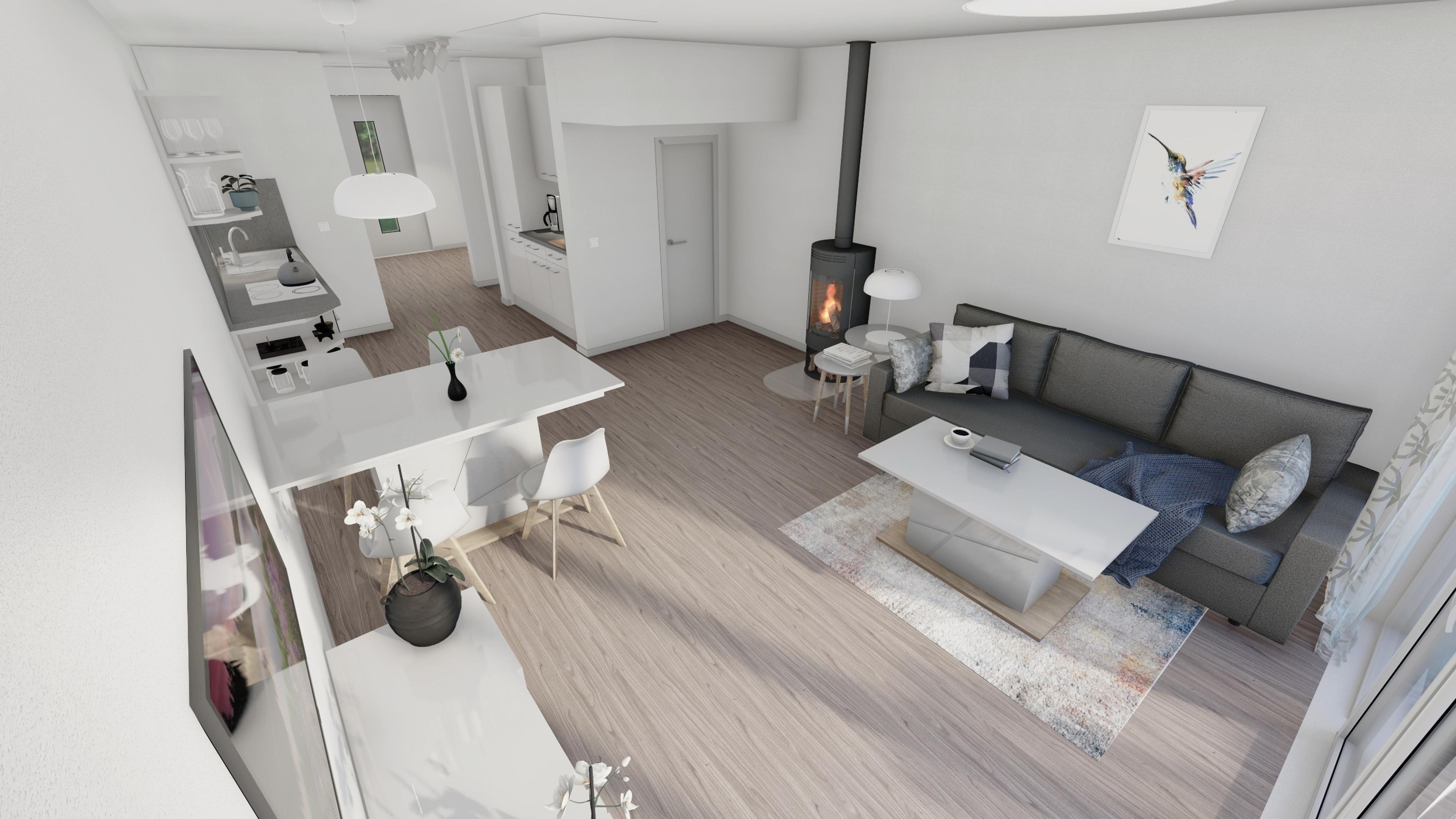 Die Nutzung der Räume variiert allerdings je nach Kategorie. Während für Familien zwei Schlafzimmer zur Verfügung stehen, ist für Paare ein Schlafzimmer sowie ein Wellnessbereich mit Jacuzzi vorgesehen. Das große Wohnzimmer mit Koch- und Essbereich im Erdgeschoss bildet die Basis des Hauses. Hier befinden sich neben einer komplett eingerichteten Küche auch ein großer Esstisch sowie gemütliche Sitzgelegenheiten für entspannte Abende am Ofen oder vor dem Fernseher. Im Obergeschoss ist der Schlaf- und Ruhebereich vorgesehen. Alle Räume werden durch große Fensterfronten mit reichlich Tageslicht durchflutet.