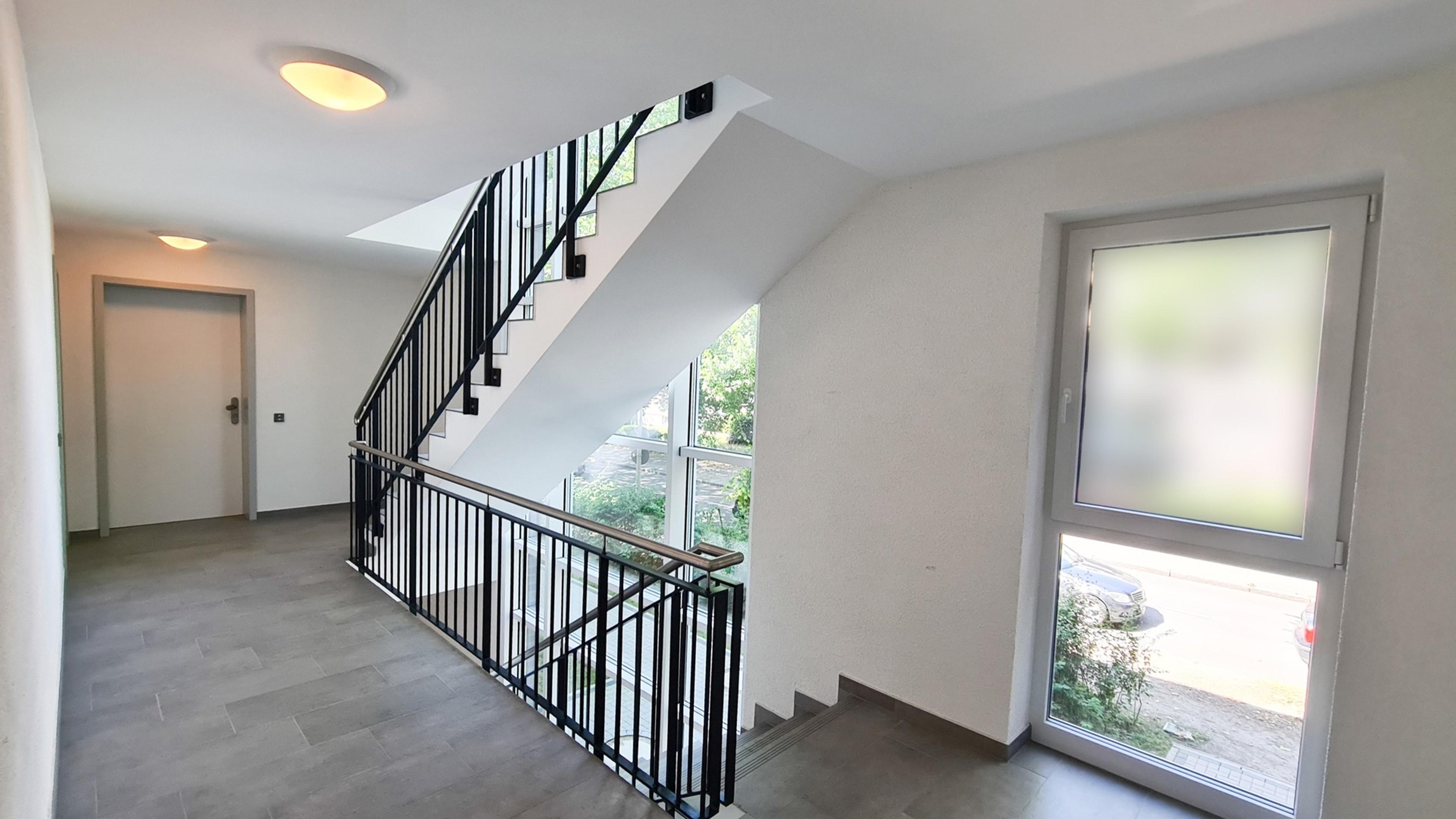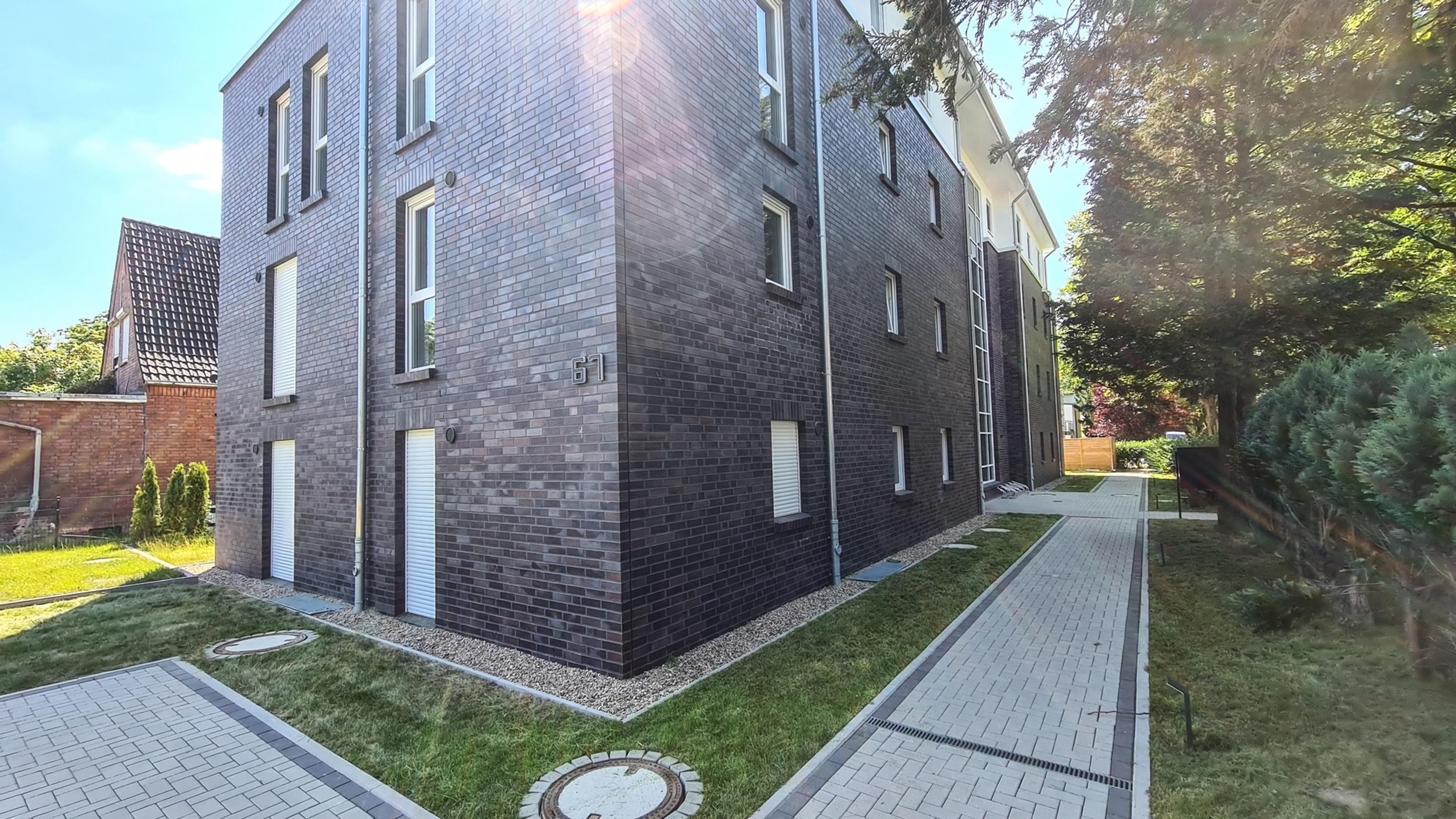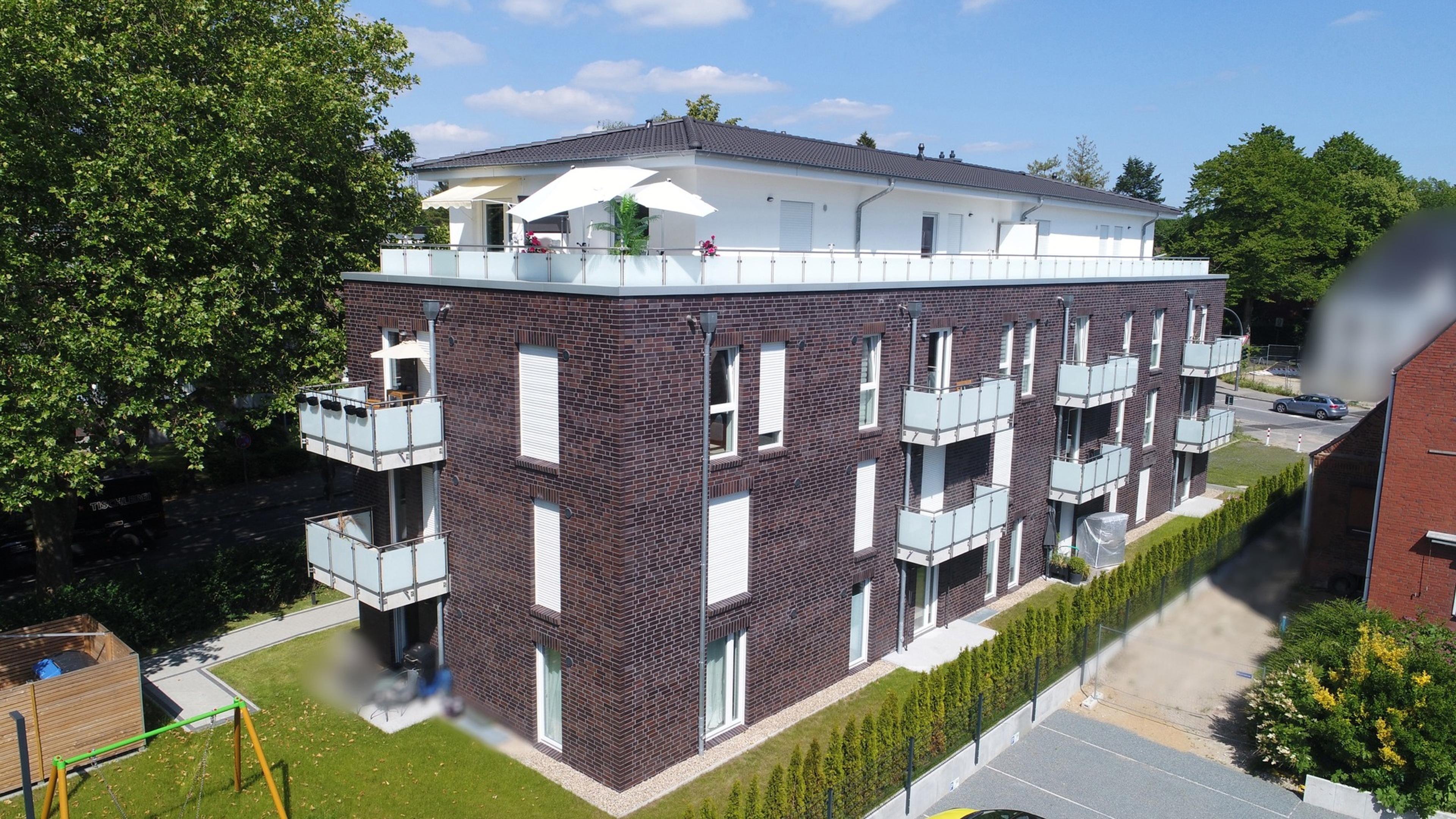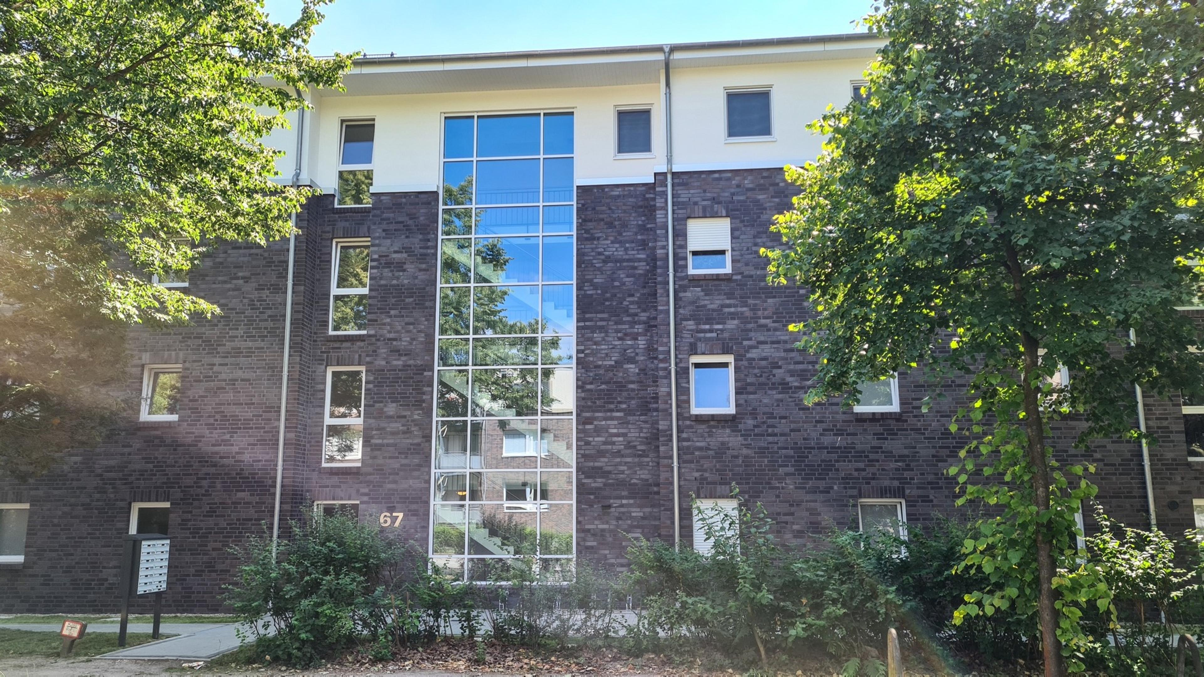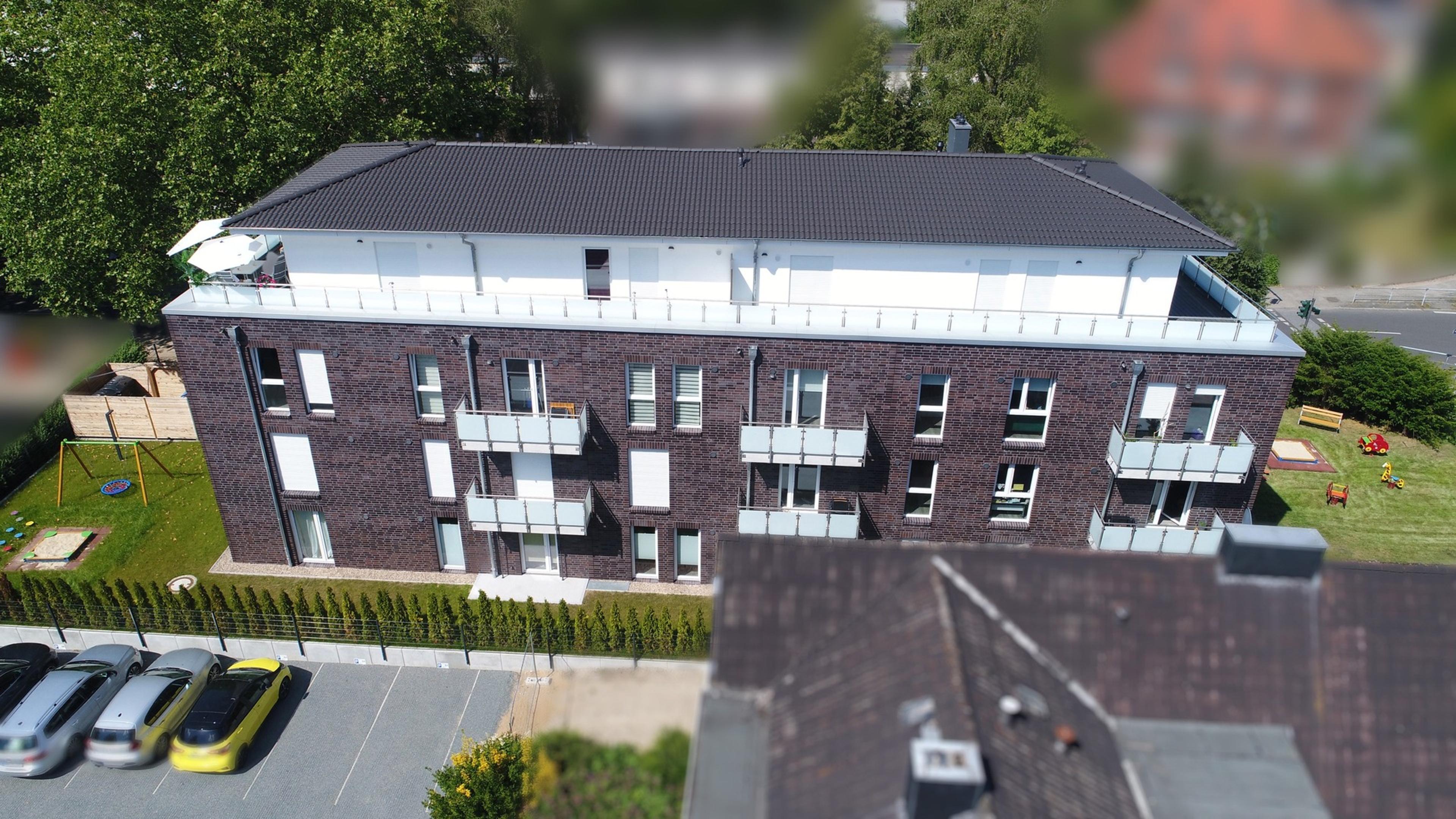 Insgesamt 14 Wohnungen umfasst dieses Mehrfamilienhaus mit drei Vollgeschossen und einem Staffelgeschoss. Das Gebäude wird in Stein auf Stein Bauweise und nach dem aktuellen, energiesparenden KfW-55 Standard errichtet. Die Einheiten mit 52 bis 89 Quadratmetern Wohnfläche bieten jeweils eine großzügige Wohnküche, ein Schlafzimmer, einen Abstellraum sowie ein Badezimmer. Außerdem verfügen alle Wohnungen mit einer Terrasse oder einem Balkon über einen eigenen Weg an die frische Luft. Alle Etagen sind über einen Fahrstuhl miteinander verbunden. Im Kellergeschoss ist für jede Wohnung ein weiterer Abstellraum vorgesehen. Darüber hinaus sind zwei Kellerräume für insgesamt 28 Fahrräder eingeplant. Ergänzt wird das Untergeschoss durch einen Raum für Mobilitätshilfen. Im Keller steht außerdem ein modernes Blockheizkraftwerk, welches die Wärmeversorgung für das gesamte Haus übernimmt.